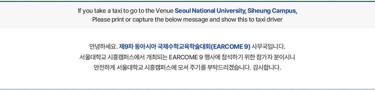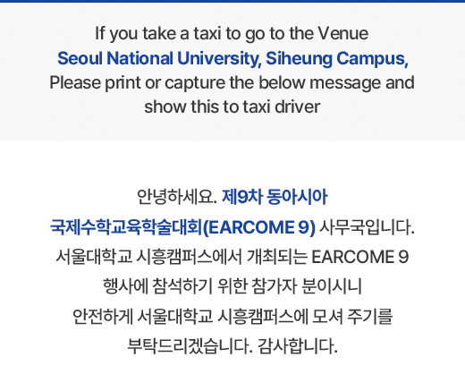 | Arrival | Halla Vivaldi Apartment → proceed on foot (2 min walk) → Seoul National University, Siheung Campus |